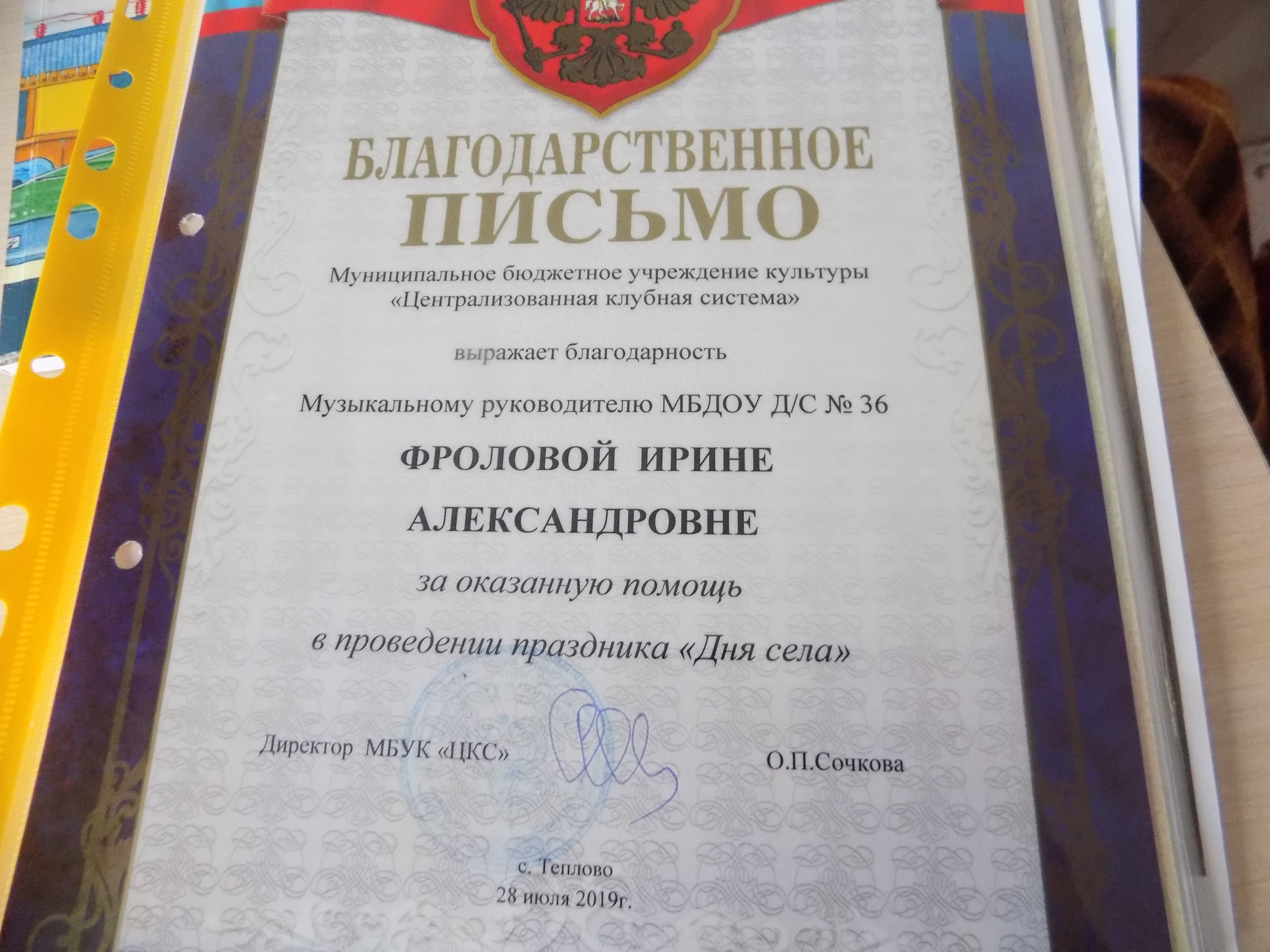 "Благодарственное письмо" МБУК "Централизованная клубная система"