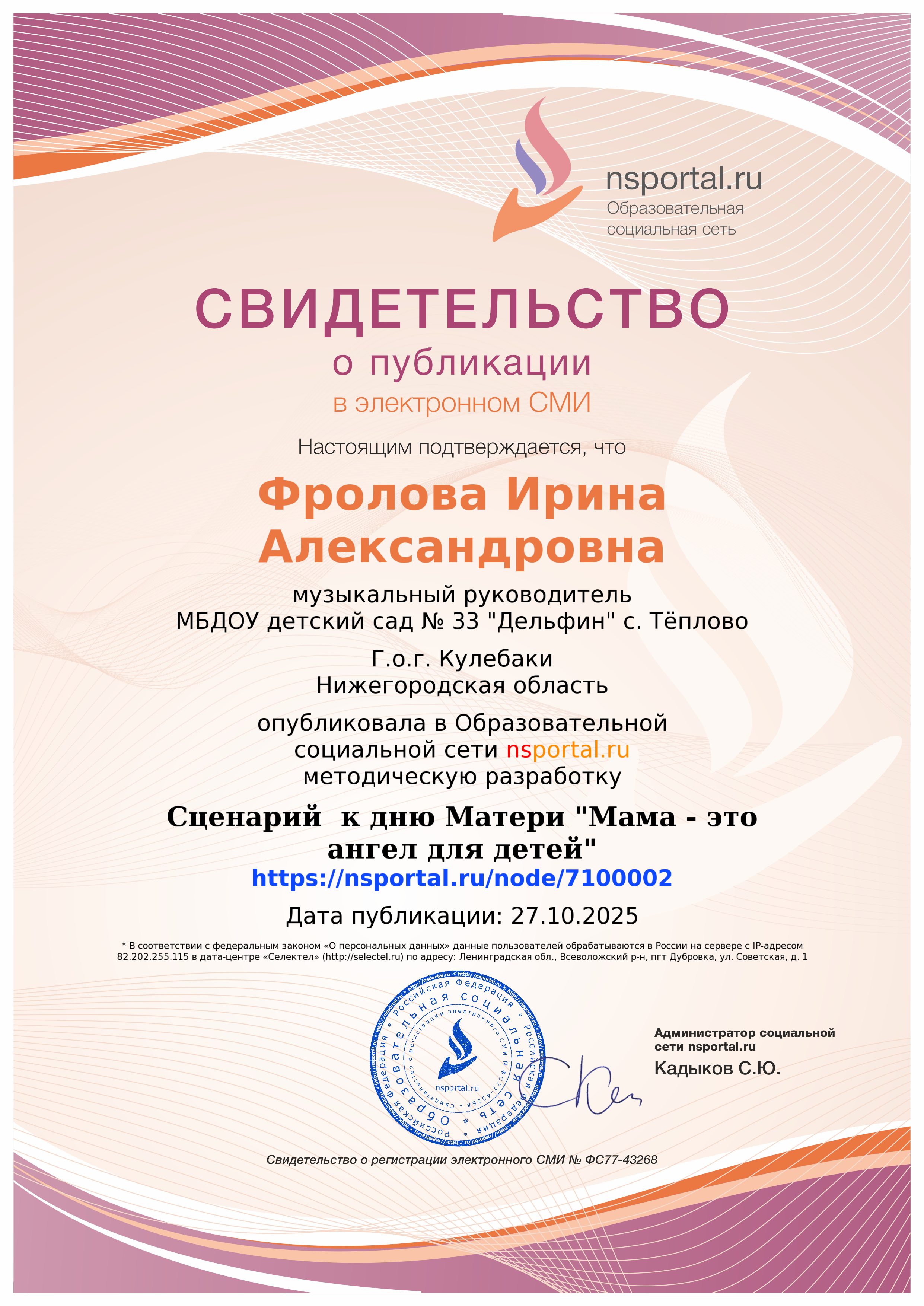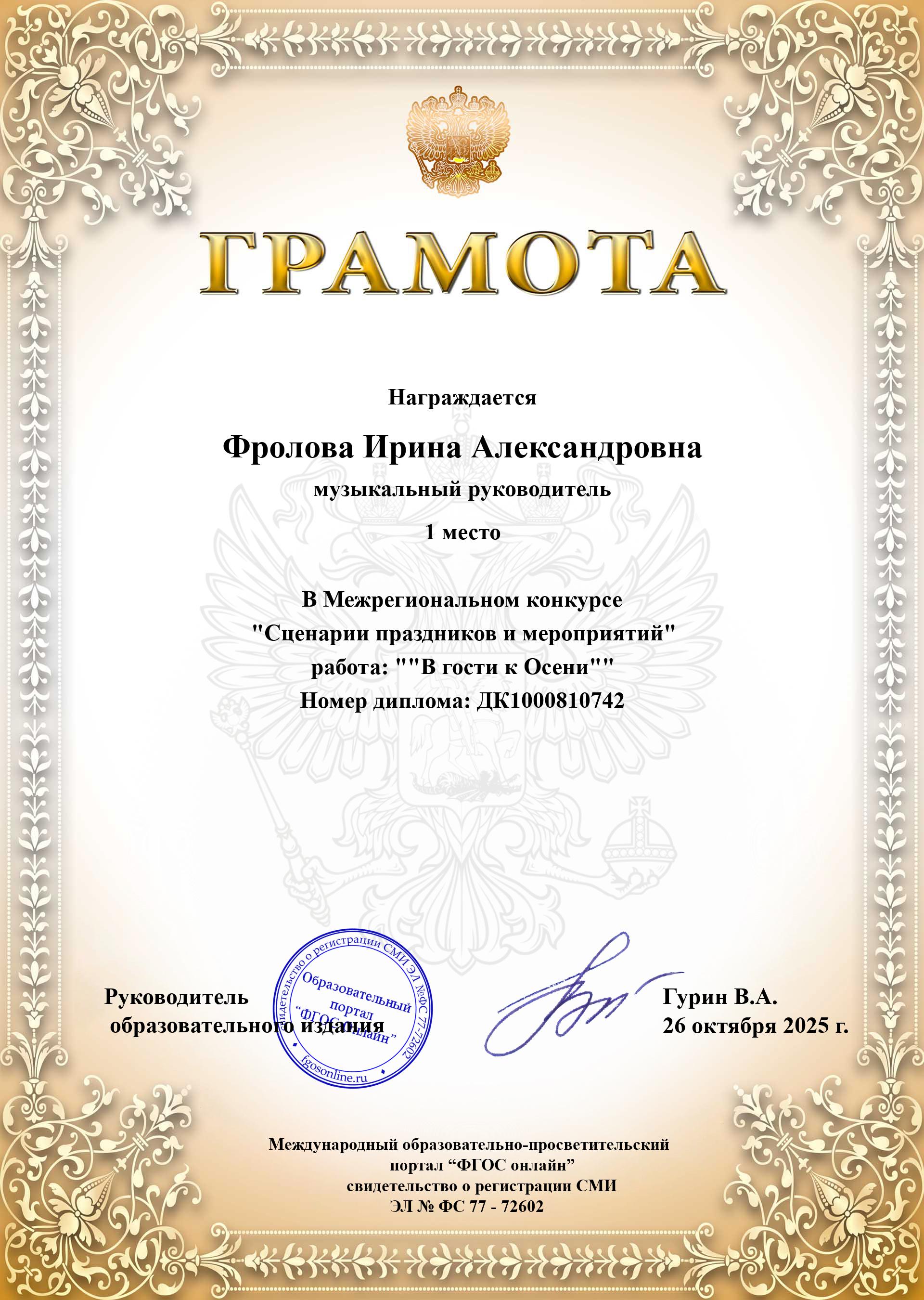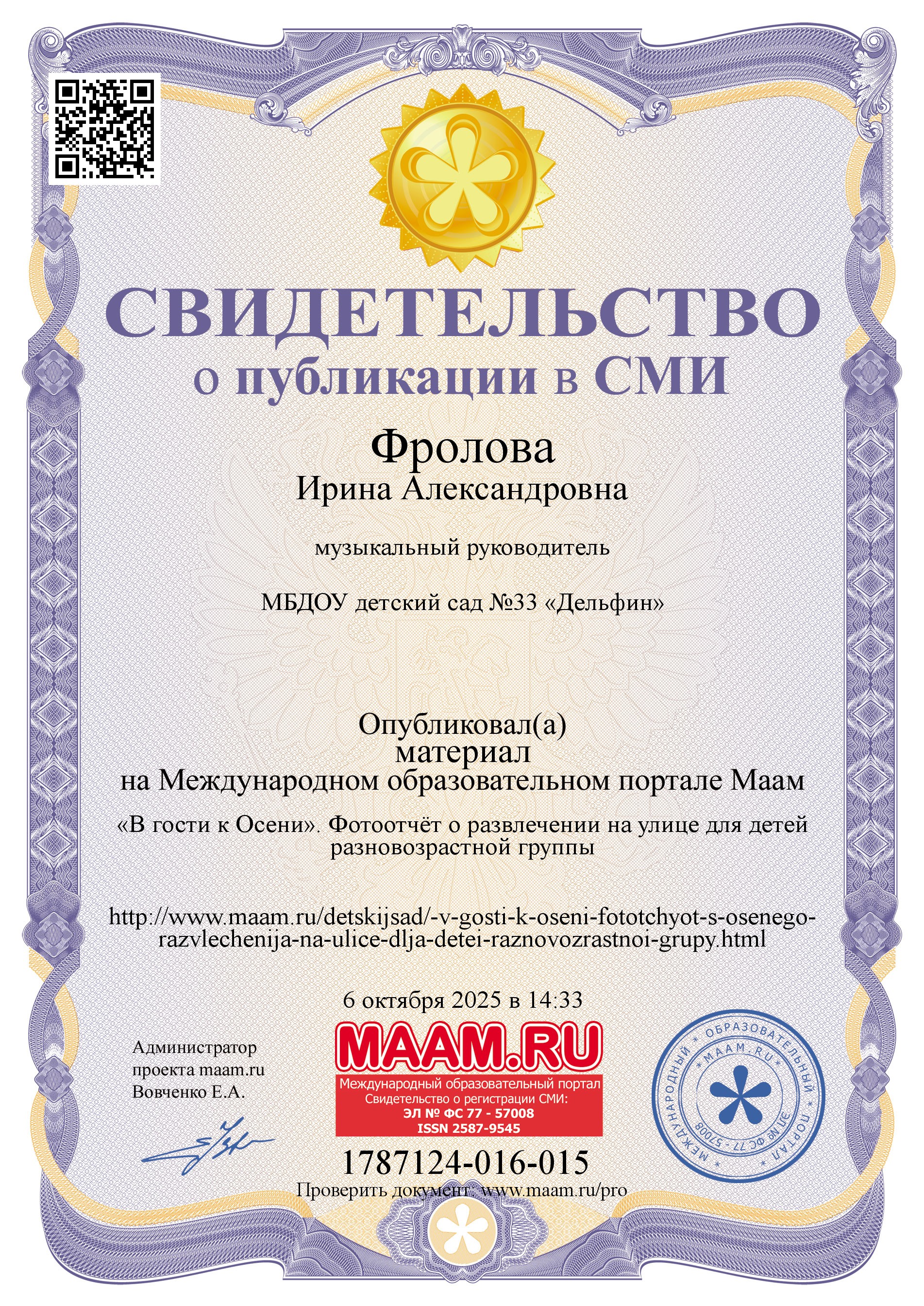 Свидетельство о публикации "Отчёт о мероприятии "В гости к Осени"