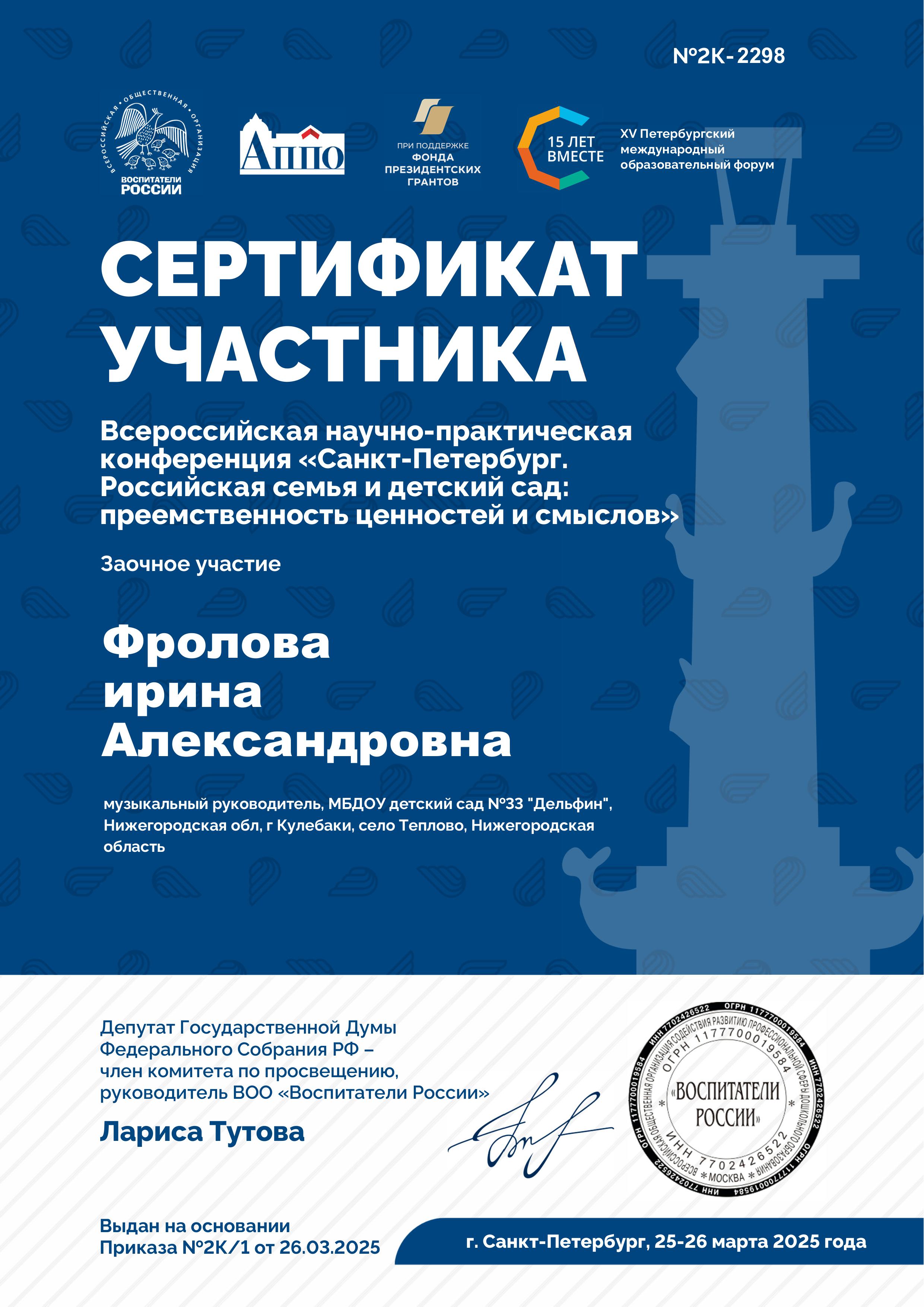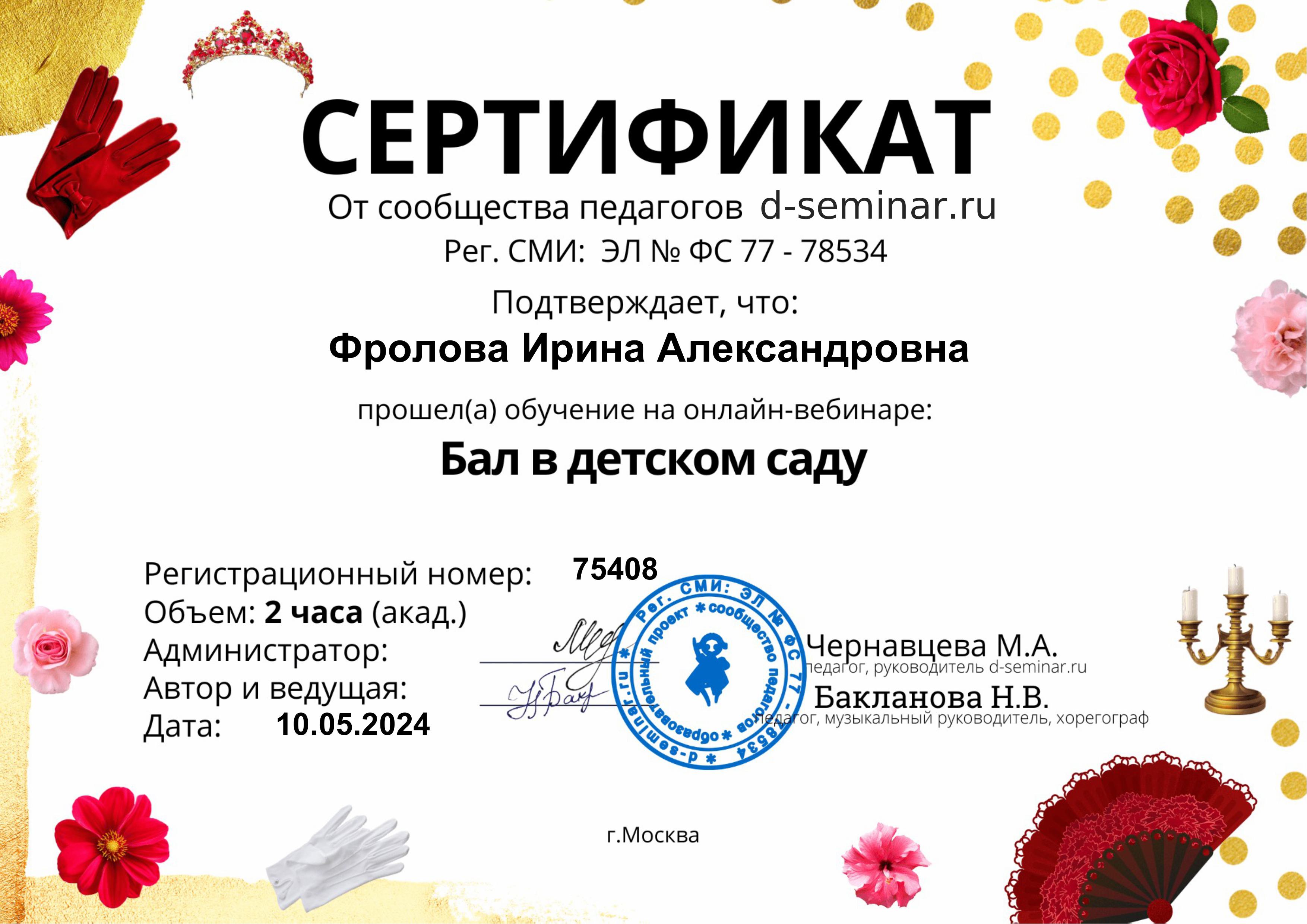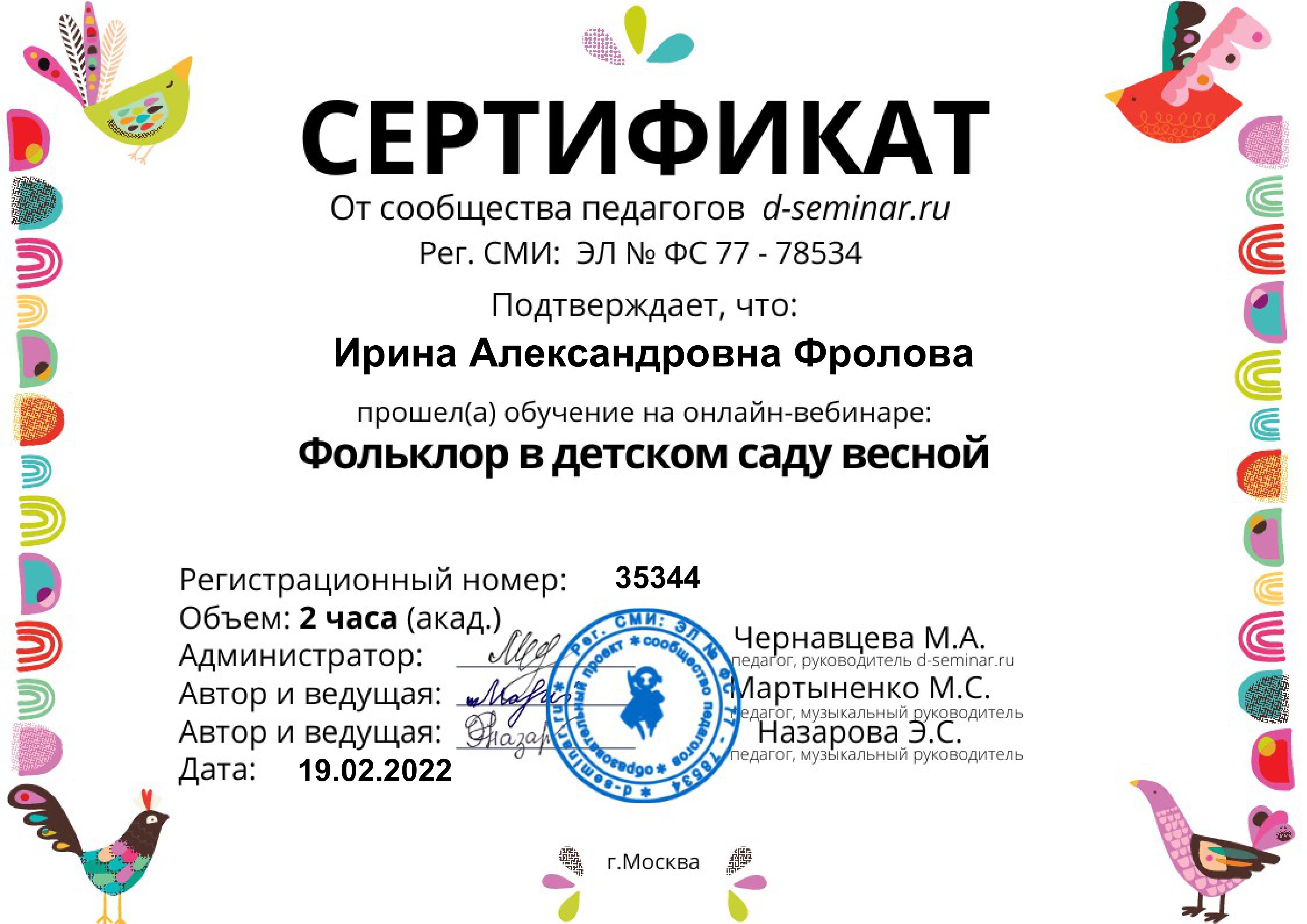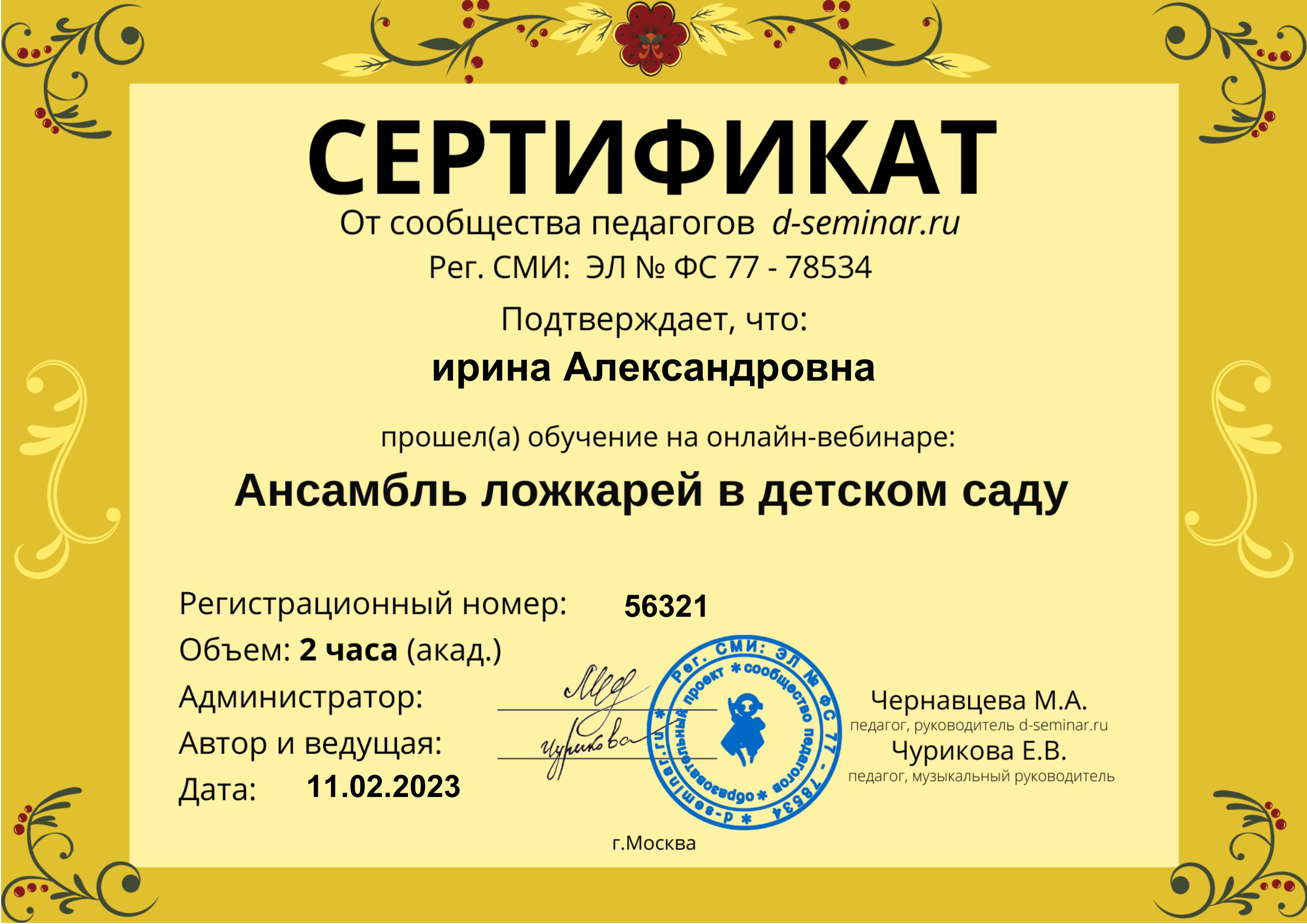 Сертификат участника вебинара "Ансамбль ложкарей в детском саду"